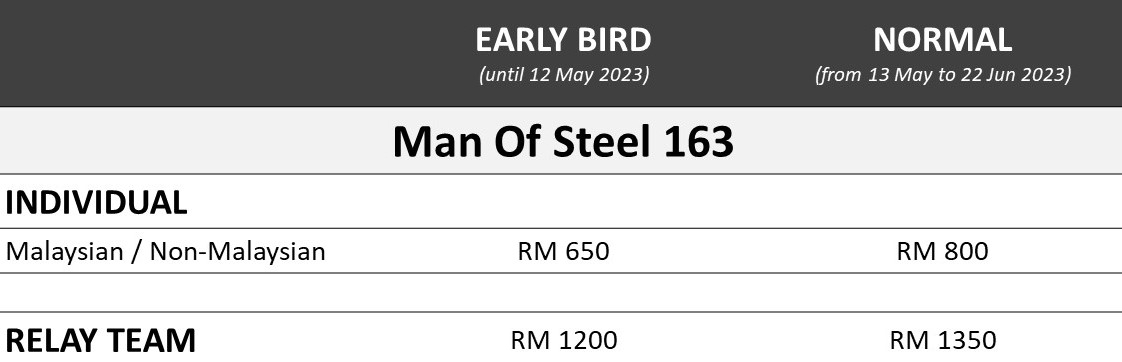 Starting with the 2-loops of 1.5km swim in the lake, Kenanga Man Of Steel Triathlon 163, will take you around beautiful journey of 130km cycle with 3-loops of 43km around the city of Putrajaya with various challenging terrains. You will continue with a 2-loops of 15km run around the Putrajaya Lake and finish in the front of the Grand stand by the lake side.