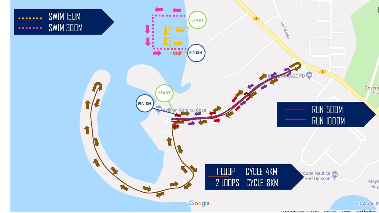 It is a to and fro 1-loop bike course, will head out towards Seremban Port Dickson Highway and then turn right at the Sua Betong intersection and cycle straight towards Kampung Barisan. Make a u-turn and return the same way back to the transition at Avillion Admiral Cove.