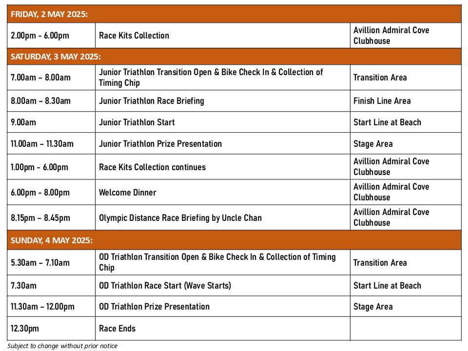 Athletes are required to collect your Race Kits individually. Collection on behalf can only be done if a pre-signed Waiver Form is presented. Signing on behalf is not allowed. It is important that you arrange your time properly when making your travel arrangements to avoid late arrivals.