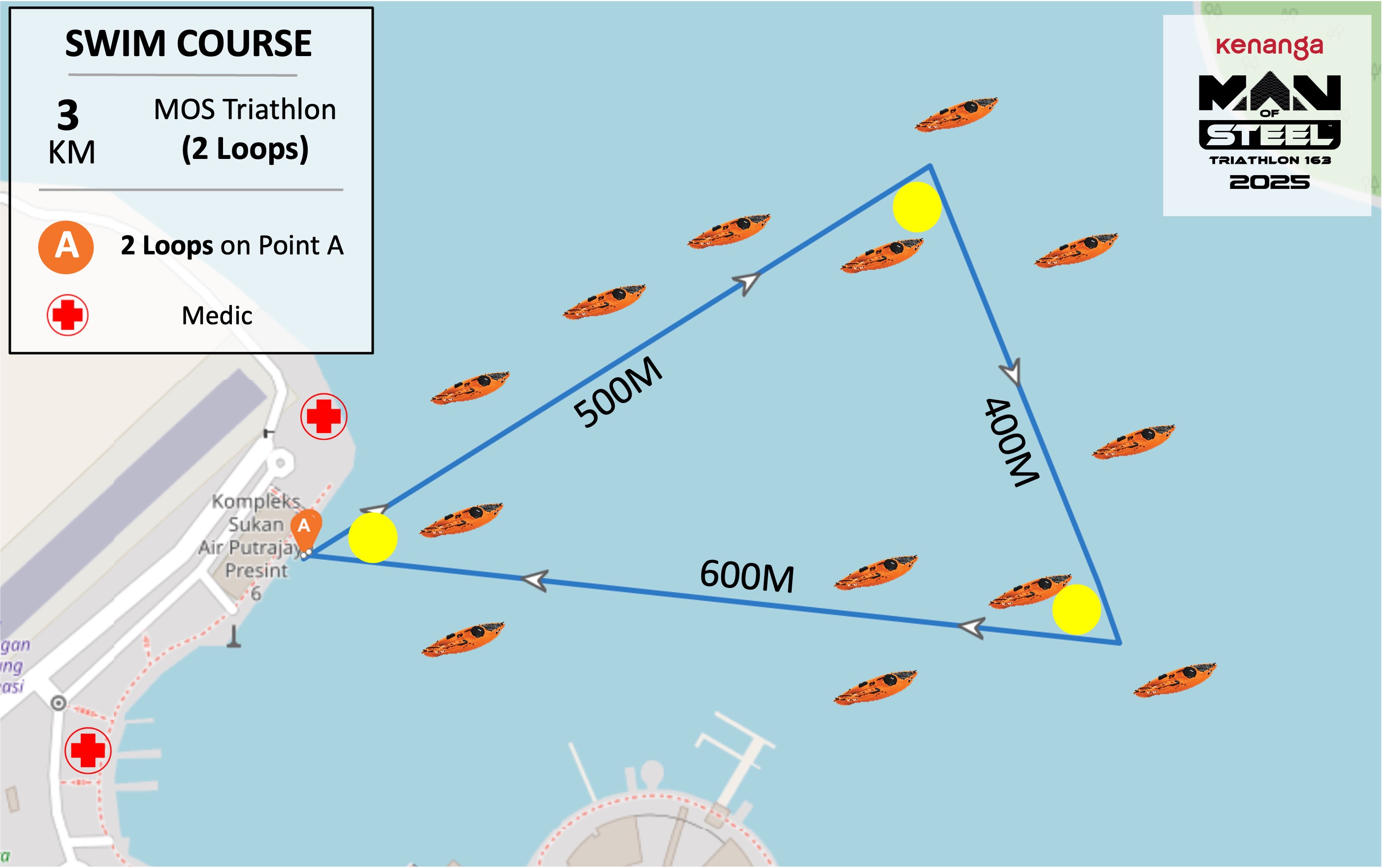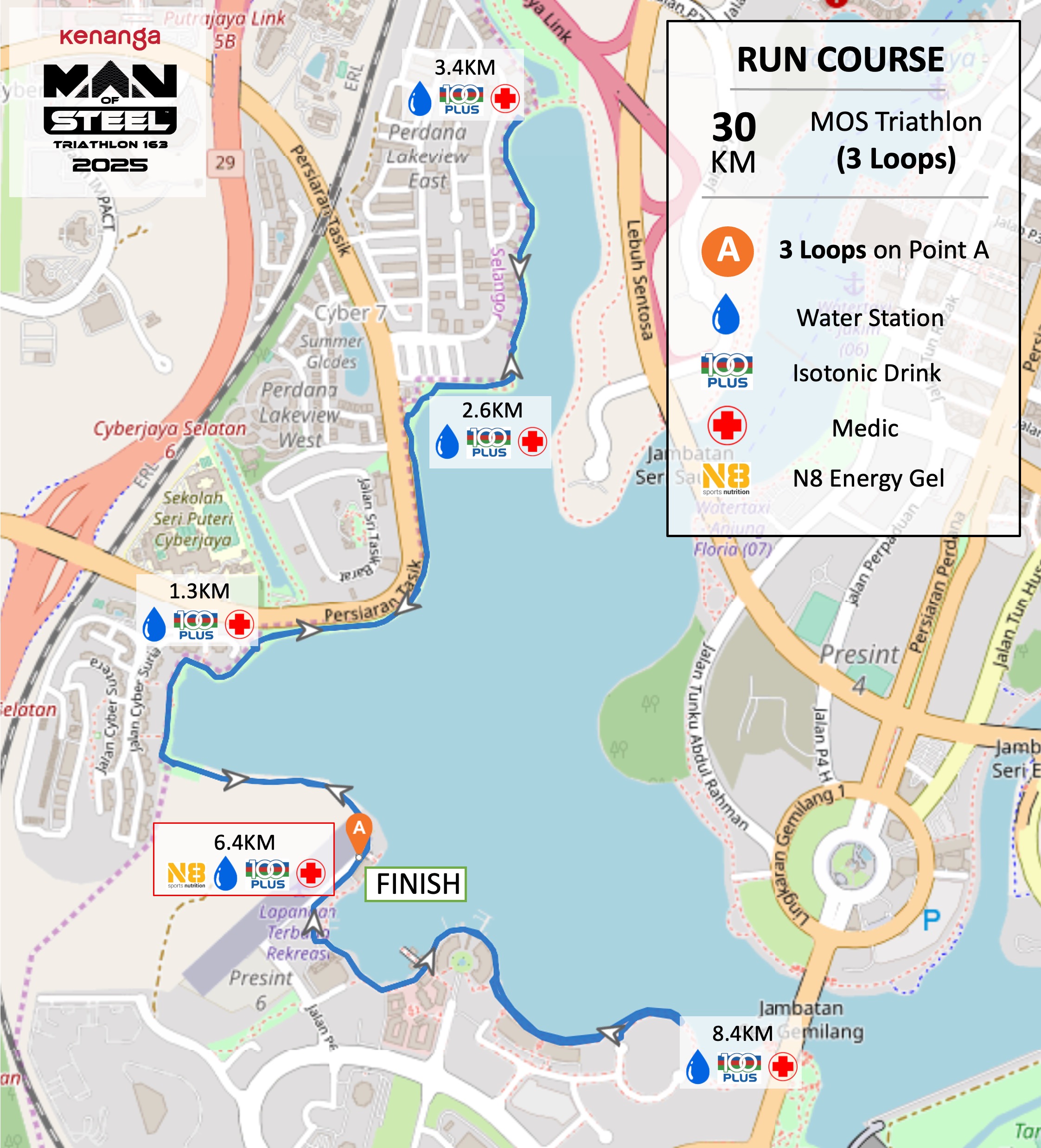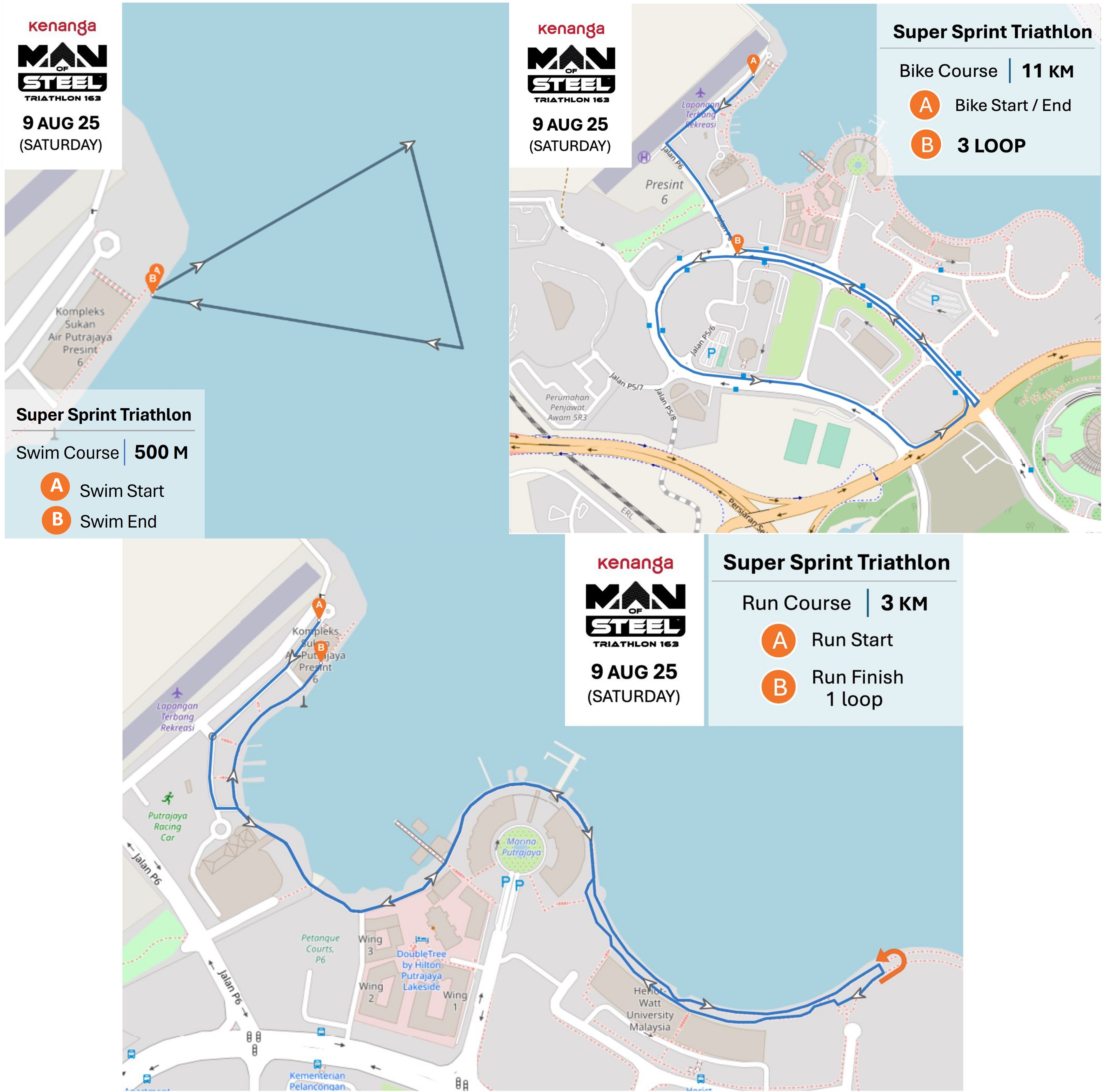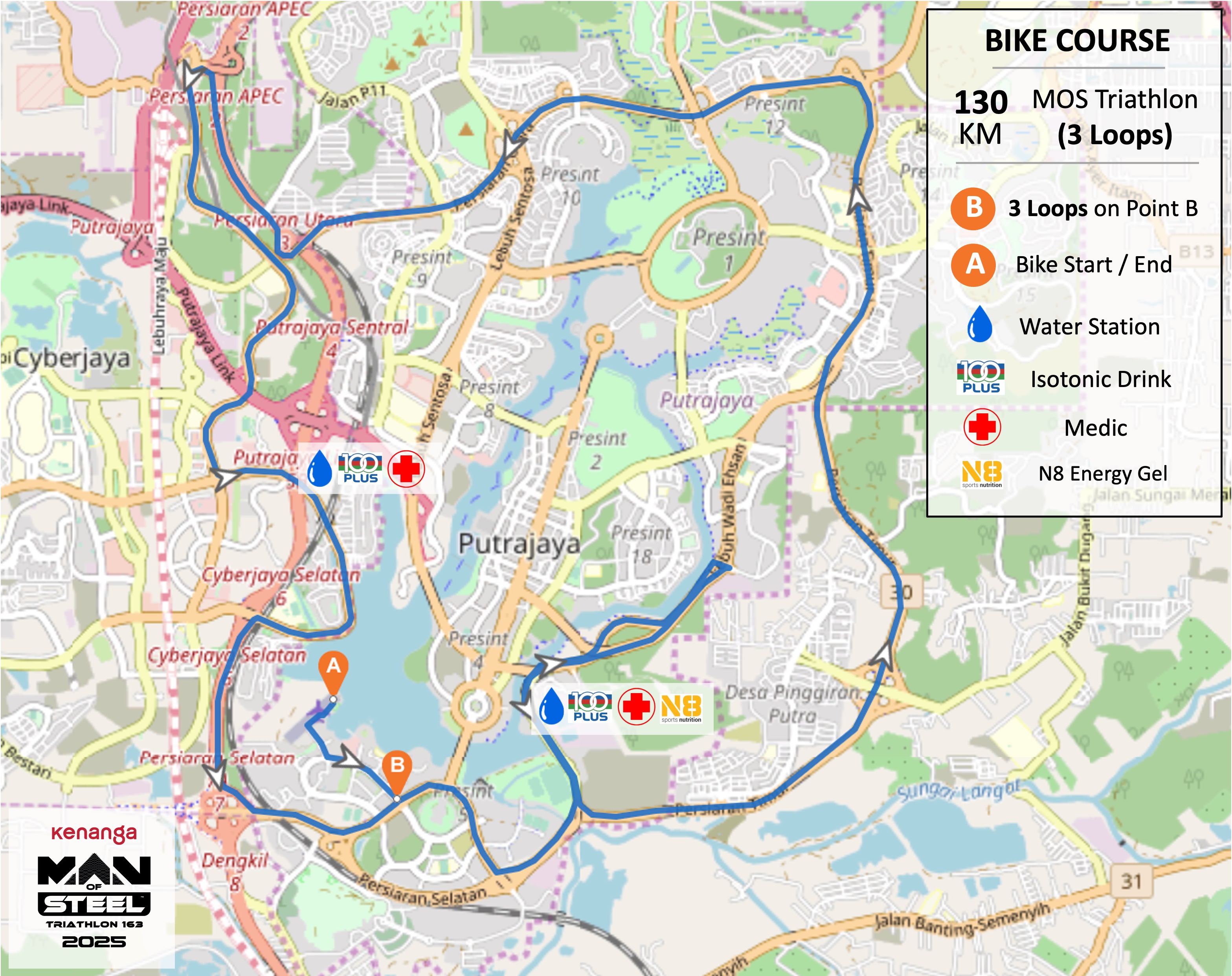Starting with the 2-loops of 1.5km swim in the lake, Kenanga Man Of Steel Triathlon 163, will take you around beautiful journey of 130km cycle with 3-loops of 43km around the city of Putrajaya with various challenging terrains. You will continue with a 2-loops of 15km run around the Putrajaya Lake and finish in the front of the Grand stand by the lake side.